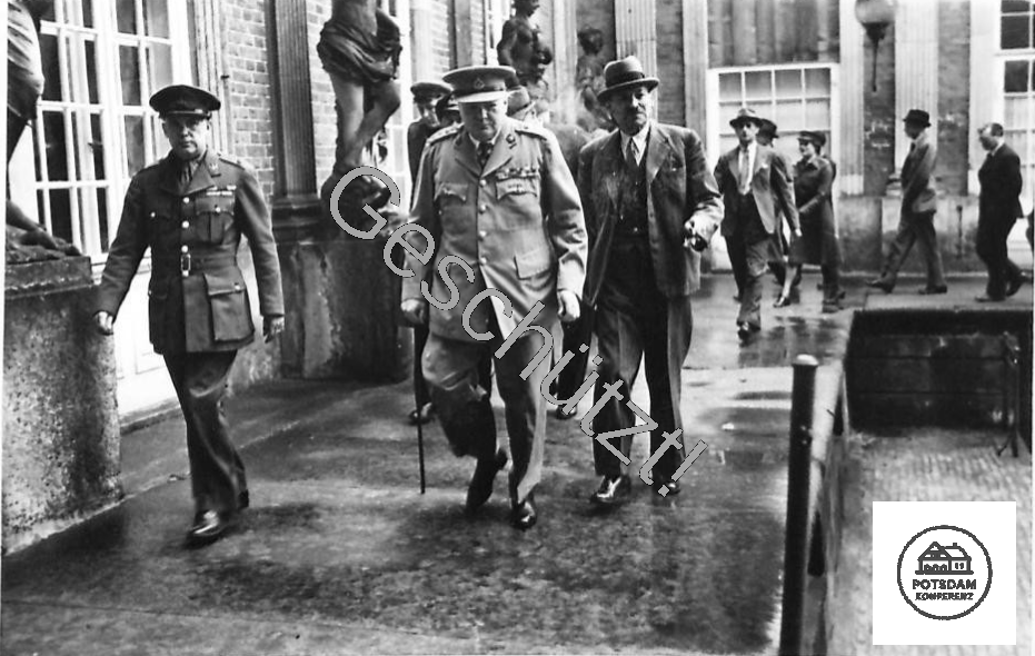 „Mr. Churchill, begleitet von J/Cdr.[1] Mary Churchill, Mr. Attlee und anderen bei der Konferenz anwesenden Personen besuchte Schloss Sanssouci, Potsdam. Bei ihrem Rundgang sahen sie viele interessante Gemälde und Räume.“[2]