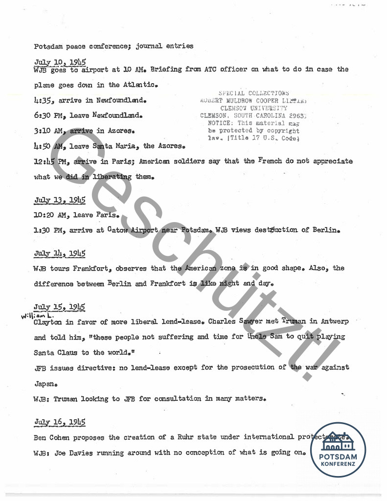 - 16Clemson University Libraries, Special Collections, Clemson, SC; Mss 243, Walter J. Brown Papers, box 10, folder 12, , Byrnes, James F.: Potsdam, Minutes, July-August 1945, pages not numbered.
